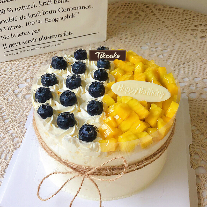 内层蛋糕胚 奶油叠层(含水果果肉填充),表层奶油 蓝莓 芒果装饰。
