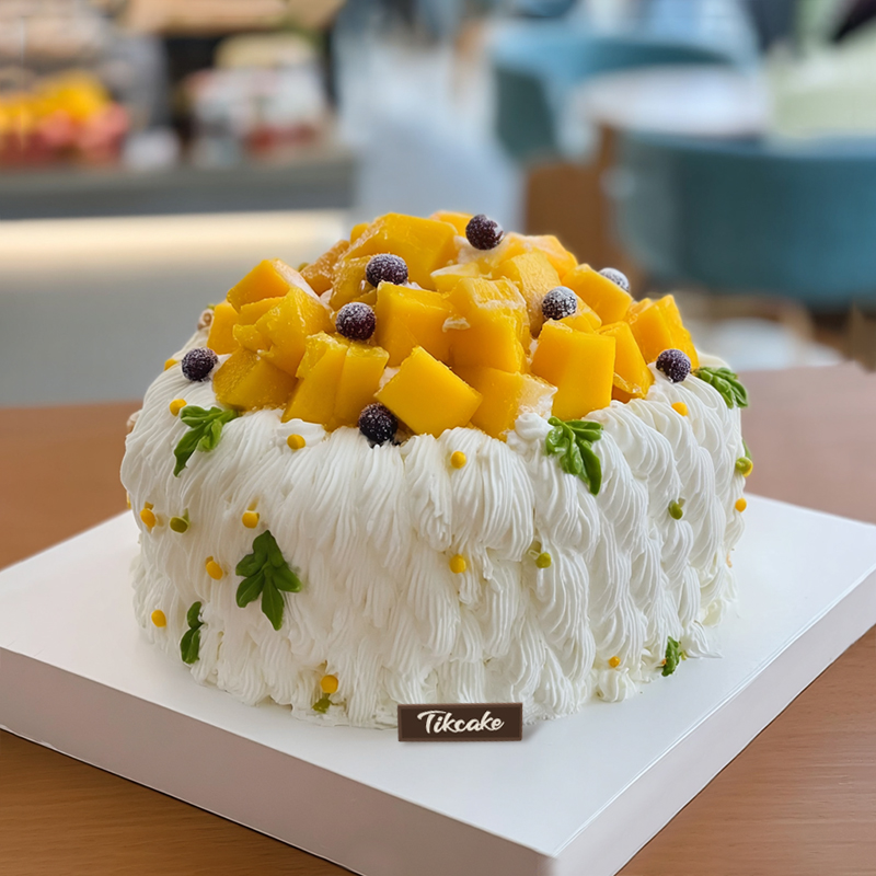 内层蛋糕胚 奶油(含水果果肉)叠加,表层奶油,芒果等装饰