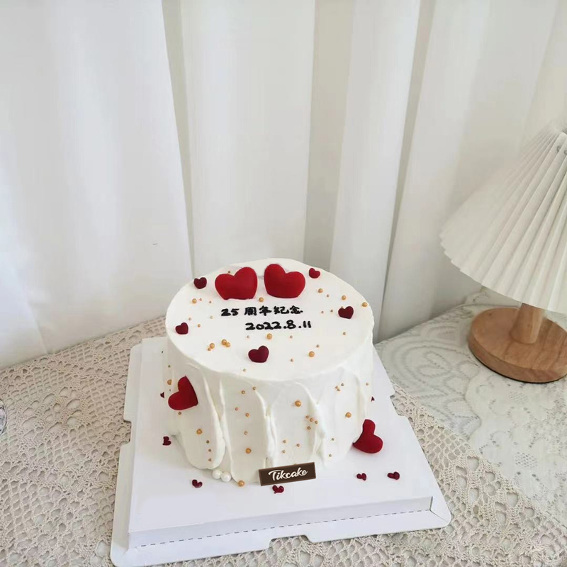 内层蛋糕胚 奶油(含水果果肉)叠加,表层奶油,巧克力爱心、糖珠装饰,手绘文字(文案可定制,请下单时留言)