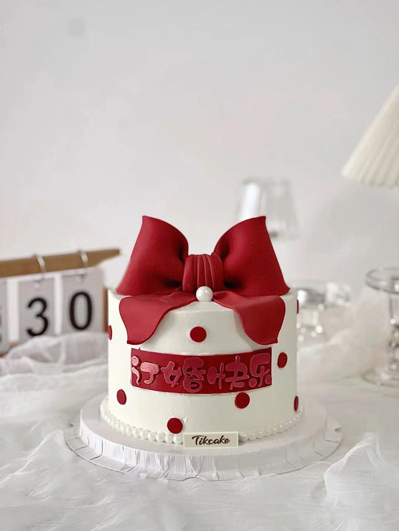 内层蛋糕胚 奶油(含水果果肉)叠加,表层订婚快乐、蝴蝶结糖珠装饰(文案可定制,请下单时留言)