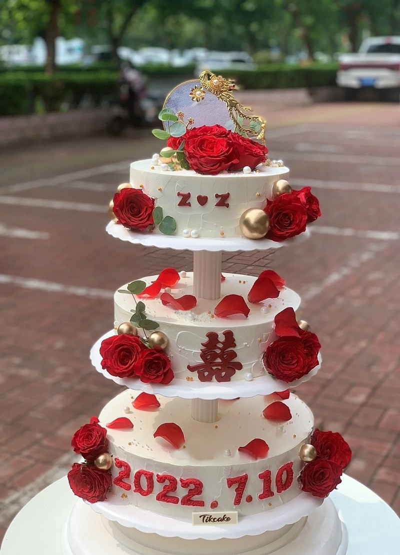 内层蛋糕胚 奶油(含水果果肉)叠加,表层红玫瑰、金球、糖珠、巧克力喜字装饰,手绘文字(文案可定制,请下单时留言)。