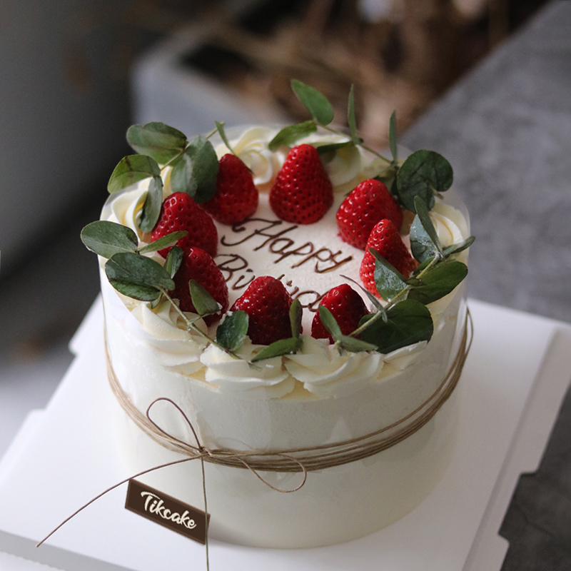 内层蛋糕胚 奶油(含水果果肉)叠层,表层奶油 草莓 尤加利叶装饰。