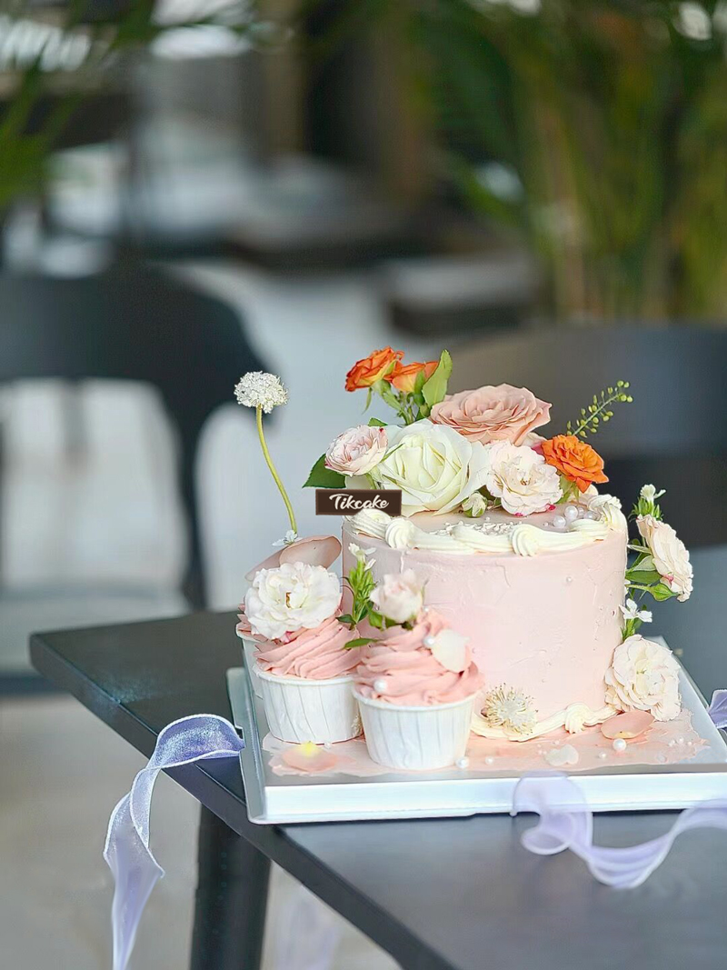 含3个纸杯蛋糕。内层蛋糕胚 奶油叠加(含水果果肉),表层鲜花,奶油等装饰
